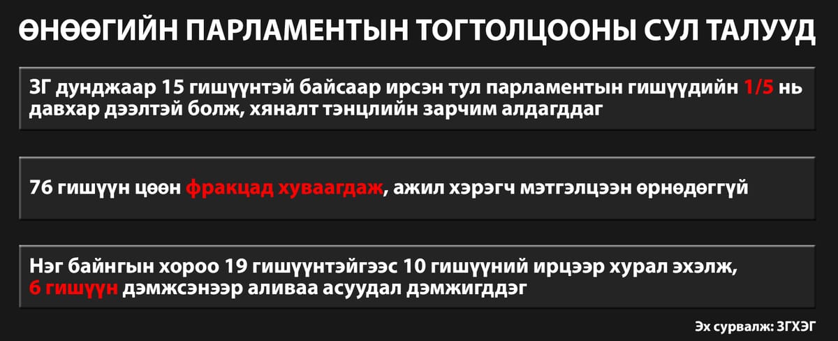 УИХ-ын нийт гишүүний тавин хувийг мажоритар, тавин хувийг пропорциональ аргаар сонгож, гишүүдийн тоог 152 болгож хүн амын тоотой уялдуулан нэмэгдүүлэх заалт бүхий Үндсэн хуульд оруулах өөрчлөлтийн төслийг ЗГ-аас УИХ-д өргөн барилаа. Одоогийн парламентын сул тал нь цэвэр системийн асуудалтай холбоотой гэж үзэж байгаа юм. Тухайлбал: