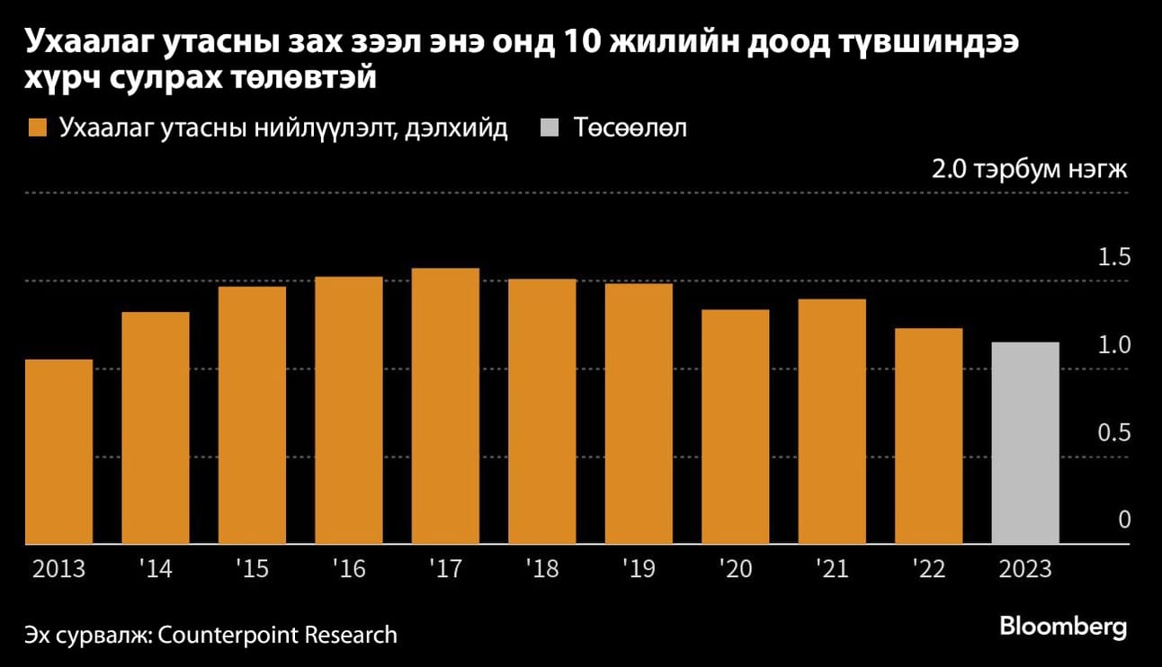 БНХАУ дефляцтай тэмцэж, АНУ-д эрэлт суларснаар 2023 онд ухаалаг утасны нийлүүлэлт дэлхийн хэмжээнд сүүлийн 10 жилийн хамгийн тааруу үзүүлэлттэй байхаар байна.