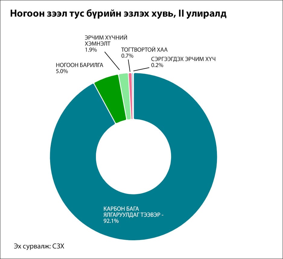 Тайлант хугацаанд нүүрстөрөгчийн ялгаруулалт багатай тээвэрт 117 тэрбум төгрөгийн зээл олгосон нь нийт зээлийн үлдэгдлийн 92.1 хувийг дангаараа бүрдүүлжээ. Харин ногоон барилга 5 хувь, эрчим хүчний хэмнэлттэй төсөл 1.9 хувийг нь эзэлсэн бол сэргээгдэх эрчим хүч 293 сая буюу ердөө 0.2 хувийг нь бүрдүүлсэн байна.