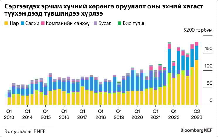 2023 оны эхний зургаан сард сэргээгдэх эрчим хүчний салбарын шинэ хөрөнгө оруулалт 358 тэрбум ам.долларт хүрч огцом өссөн нь өмнөх оны мөн үеэс 22 хувиар өссөн дүн болоод зогсохгүй бүх цаг үеийн дээд үзүүлэлт боллоо.