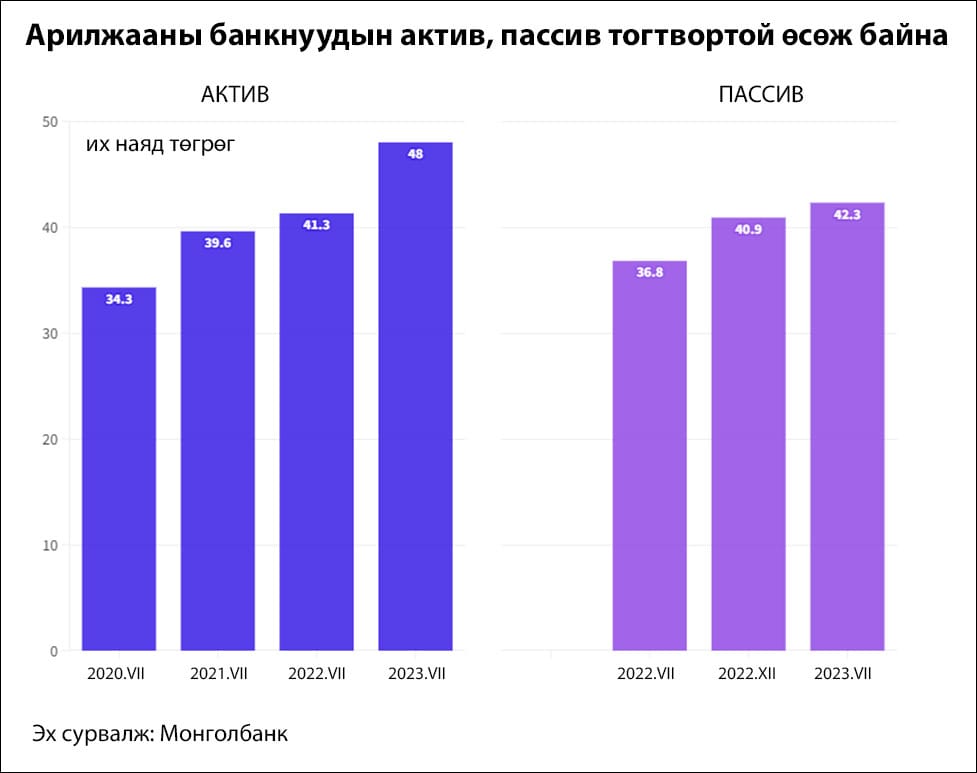 Банкны салбарын нийт актив хөрөнгийн хэмжээ долоодугаар сарын эцсийн байдлаар 48 их наяд төгрөг болж өмнөх оны мөн үетэй харьцуулахад 16.1 хувиар өслөө. Харин пассив хөрөнгийн хэмжээ 42.8 их наяд төгрөг болж, 16.3 хувиар өсжээ.