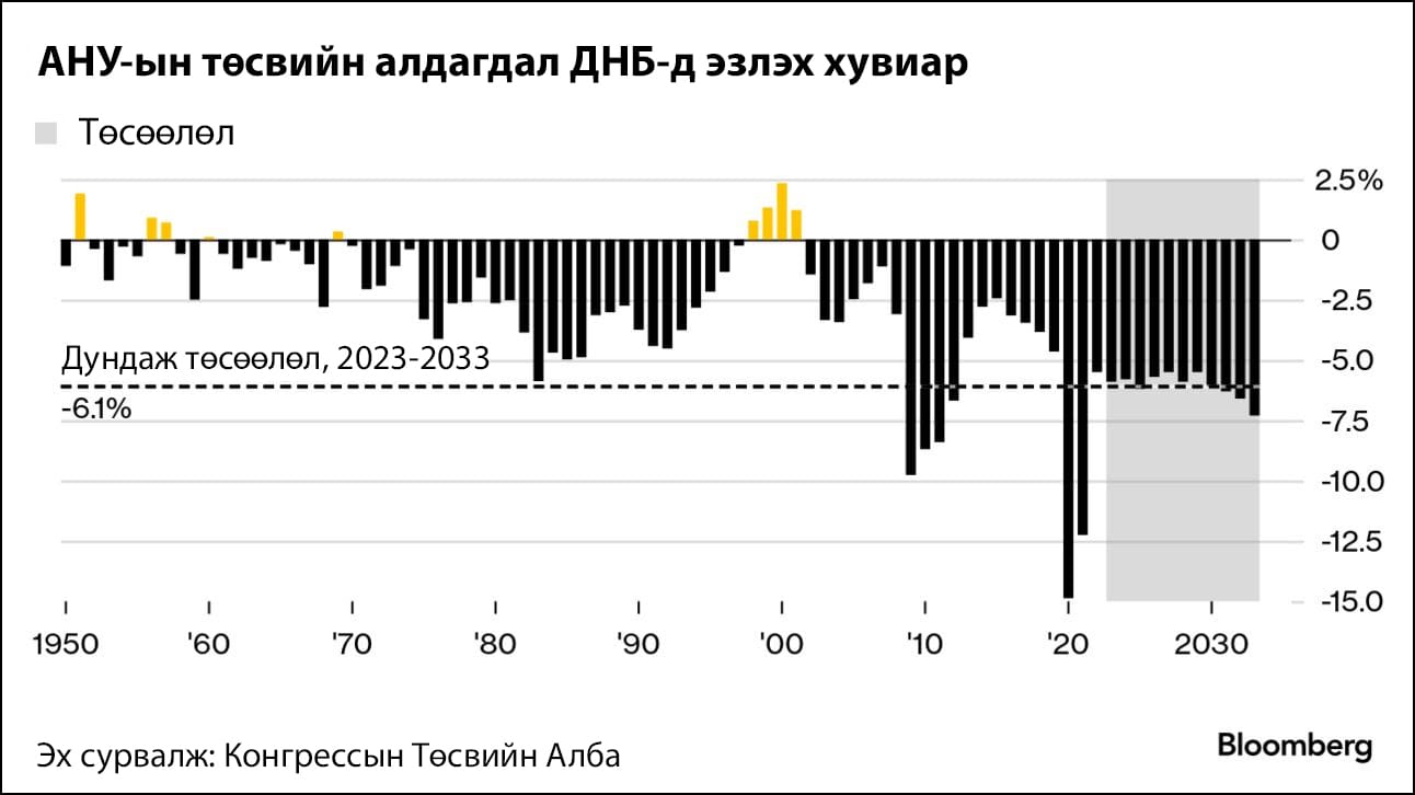 Эдийн засаг тэлж, иргэдийн хөдөлмөр эрхлэлт нэмэгдэж, сүүлийн 50 гаруйн жилийн хугацаанд ажилгүйдлийн түвшин хамгийн доод цэгтээ хүрээд байгаа 2023 онд гэхэд л АНУ-ын төсвийн алдагдлын ДНБ-д эзлэх хэмжээ 5.8 хувьтай гарахаар байгааг Конгрессын Төсвийн Алба мэдээлжээ. Тус улс Дэлхийн хоёрдугаар дайны рекорд үзүүлэлтийг эвдэх хэмжээний өрийн дарамтыг өдгөө үүрч явна.