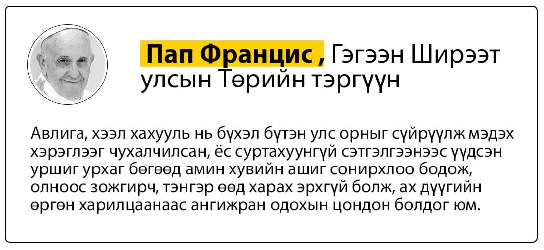 Гэгээн ширээт Улсын төрийн тэргүүн Пап Францисын Монгол Улсад хийж буй Төрийн айлчлал өнөөдөр өндөрлөнө. Тэрбээр өчигдөр Монголд албан ёсоор бүртгэлтэй 12 шашны төлөөлөлтэй уулзсаны зэрэгцээ 3,500-аад сүсэгтэн оролцсон Гэгээн мөргөлийн үйл ажиллагаанд оролцсон юм. Мөн Пап Францис Гүюг хааны захидлын дэвшилтэт технологиор дээд зэргийн чанартайгаар үйлдсэн албан ёсны хуулбарыг бэлэг болгон өгсөн нь айлчлалын онцлох үйл явдал байв.