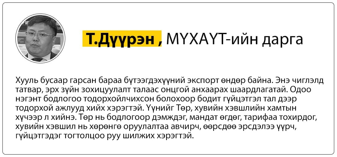 Монгол Улсын экспортын 5 хүрэхгүй хувийг уул уурхайн бус бүтээгдэхүүний экспорт эзэлж байхад жижиг дунд үйлдвэрлэл, худалдаа үйлчилгээний салбар нийт ажлын байрны 70 хувийг бүрдүүлж байгаа нь анхаарах үзүүлэлт. МҮХАҮТ-ын онцолсон шийдэл гэвэл гадаад худалдааг ченжүүд, худалдан авагчдын оролцоогүйгээр хийж, тэр дундаа гадаадад худалдааны төвүүд байгуулах замаар уул уурхайн бус гаралтай, хөдөө аж ахуйн бүтээгдэхүүний экспортыг дэмжих явдал аж.