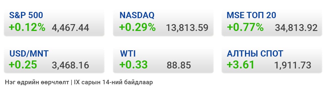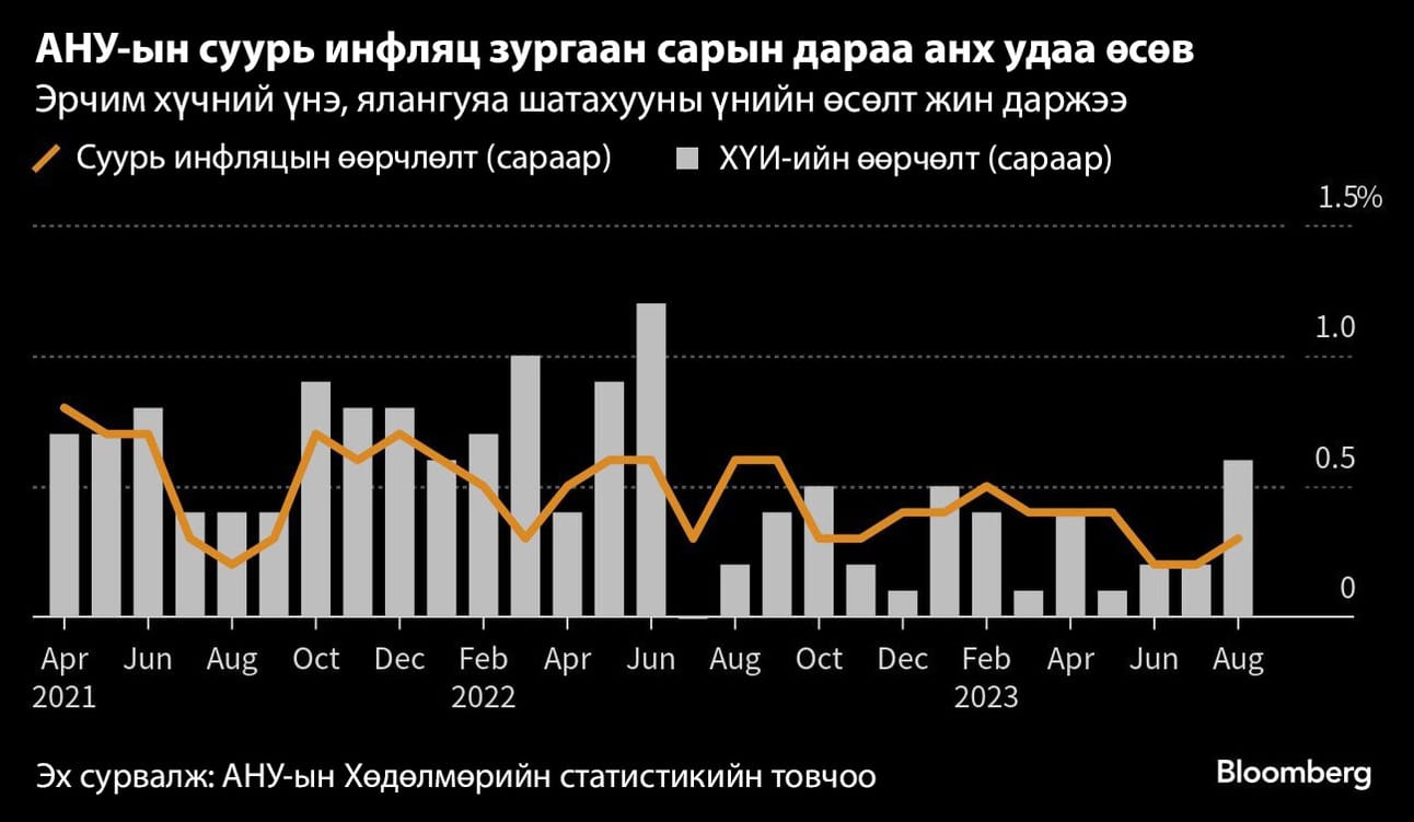 Хүнс болон эрчим хүчний үнийг хасаж тооцсон АНУ-ын наймдугаар сарын суурь инфляц өмнөх сараасаа 0.3 хувиар өссөн нь сүүлийн зургаан сарын анхны өсөлт болсон байна. Энэ нь Холбооны нөөцийн банк бодлогын хүүгээ өсгөхөө түр азнах ч хатуу бодлогоо сулруулахгүй гэсэн таамгийг бататгасан бол хувьцаа, бонд болон ам.долларын ханшийн хөдөлгөөнд дээрх тайлан тийм ч их нөлөөлсөнгүй.