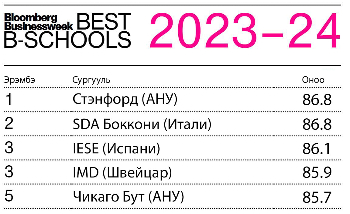 “Bloomberg Businessweek”-ээс жил бүр тодруулдаг дэлхийн шилдэг бизнесийн сургуулиудын 2023 оны эрэмбийг Стэнфордын Бизнесийн сургууль тав дахь жилдээ дараалан тэргүүлжээ. Оюутнууд, төгсөгчид, ажилтнуудын дунд явуулсан судалгаанд үндэслэн гаргадаг тус жагсаалтаас өөр онцлох зүйлс юу байсныг харцгаая.