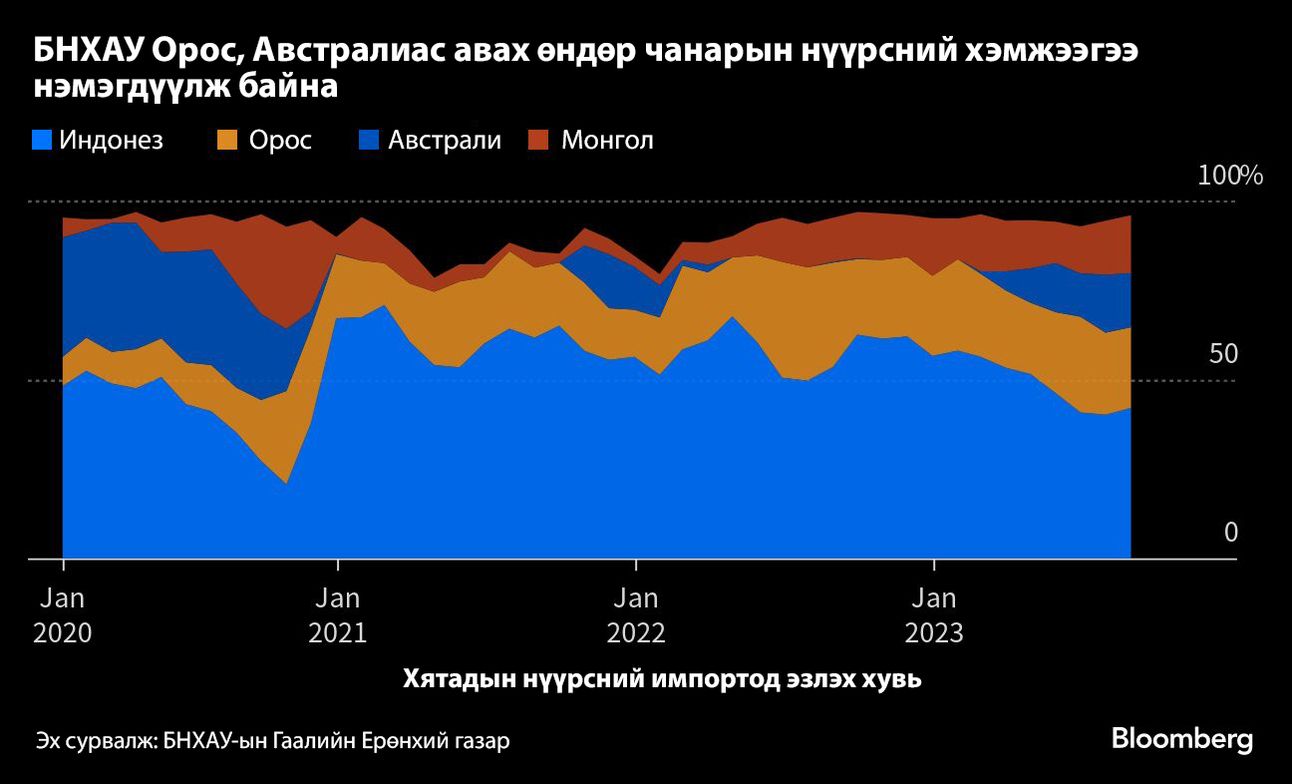 “БНХАУ-ын нүүрсний зах зээлд ОХУ, Австралийн эзлэх хувь нэмэгдэж байгаа бол Монголынх тогтвортой хэвээр байна. Харин гол нийлүүлэгч Индонезийн эзлэх хувиас булааж байна” гэж “Fenwei Energy Information Service”-ийн шинжээч Эми Шү мэдэгдсэн юм.