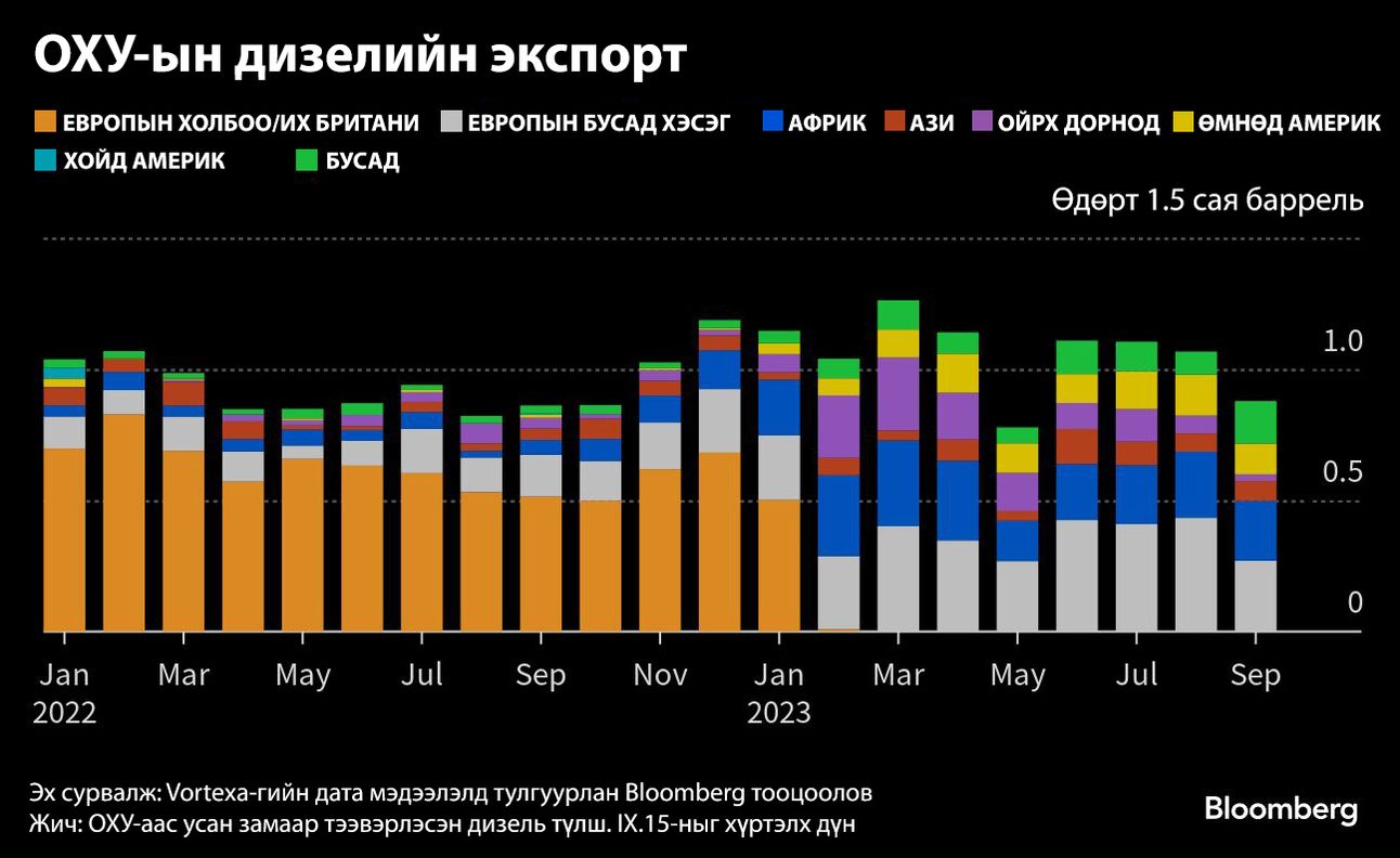 Оросын хориг зарлагдахаас өмнө дэлхий дахинд дизелийн нийлүүлэлт аль хэдийн ноцтой хүндрэлд ороод байв. OPEC-ийн өргөтгөсөн бүлэг гарцаа танасан нь газрын тосны бүтээгдэхүүний эрэлт өсөхтэй давхацсанаар боловсруулах үйлдвэрүүдийн гарц буурч байгаа. Украины дайнаас өмнө Оросын далайгаар тээвэрлэх дизелийн экспорт голчлон Европыг чиглэж байсан бол хориг арга хэмжээнүүдийн дараа Турк, Бразил, Саудын Араб гол худалдан авагчид нь болжээ.