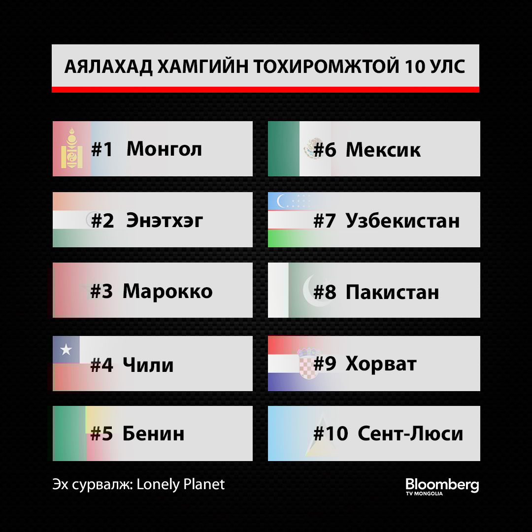 "Lonely Planet" 2024 онд аялахад тохиромжтой шилдэг 10 улсын жагсаалтдаа өргөн уудам нутаг, адал явдлаар дүүрэн аялал, баялаг соёл уламжлалыг нь харгалзан Монгол Улсыг нэгдүгээрт оруулснаа мэдээлсэн байна.