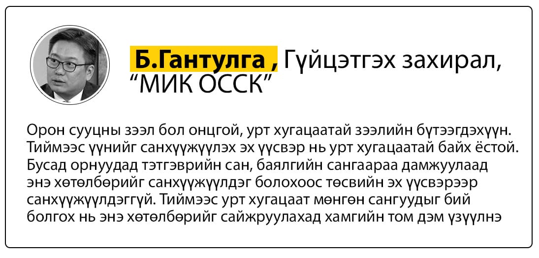 Эх үүсвэрийн дутагдлыг нь арилгах шийдэл гэвэл ипотекийн зээлийн хөтөлбөрийг олон улсын туршлагын дагуу баялгийн сангийнхаа эх үүсвэрээр санхүүжүүлэх боломж бий. Урт хугацааны эх үүсвэрийг орон сууцны зээлийн санхүүжилтийн зах зээл рүү оруулж чаддаг механизмыг нэвтрүүлж чадвал иргэдийн өрхийн орлогод илүү нийцсэн бүтээгдэхүүн бий болгох боломж нэмэгдэхийг “Монголын Ипотекийн Корпораци ОССК” ХХК-ийн Гүйцэтгэх захирал Б.Гантулга хэлж байлаа.