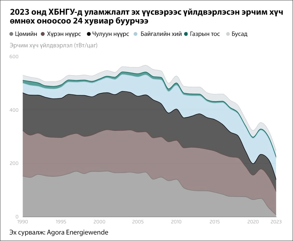 Нүүрсний хэрэглээ тооцооллоос давж огцом буурсан нь 2023 онд ХБНГУ-ын нүүрстөрөгчийн давхар ислийн ялгарал сүүлийн 70 жилийн доод түвшиндээ хүрч буурахад нөлөөлснийг Agora Energiewende сүүлийн тайландаа онцолжээ. Тодруулбал нүүрсний цахилгаан станцуудынх нь эрчим хүч үйлдвэрлэл 1960-аад оноос хойших доод түвшиндээ хүрч, дангаараа 44 сая тонн CO2 агаар мандалд ялгарахаас сэргийлсэн байна.