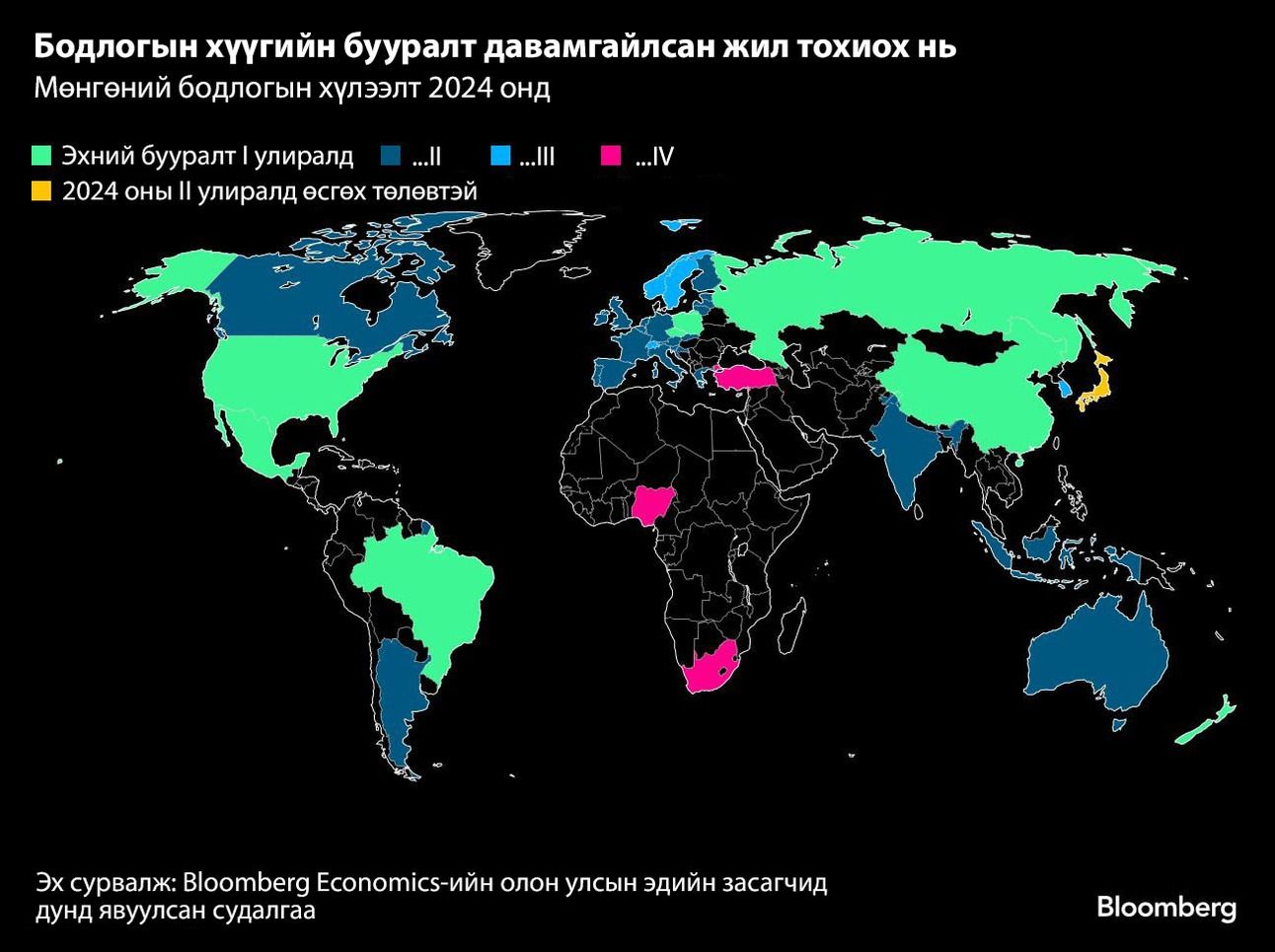 Ирэх 12 сарын турш дэлхий даяар бодлогын хүүгийн буурах цикл давамгайлах төлөвтэй. 2022, 2023 онуудад сүүлийн олон арван жилд байгаагүй эрчтэйгээр мөнгөний бодлогоо чангаруулсан Төв банкнууд инфляц тогтвортой саарч буй энэ үед бодлогын хүүгээ удахгүй бууруулж эхлэх хүлээлттэй байна.