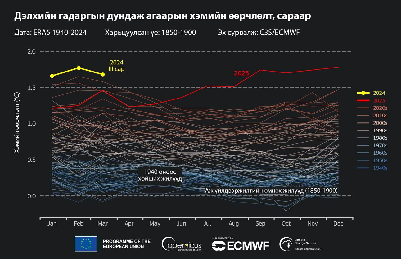 Европын Холбооны Коперникийн Уур амьсгалын өөрчлөлтийн албаны мэдээлснээр III сард дэлхий даяар агаарын хэм түүхэн дунджаасаа цельсийн 1.68 хэмээр халуун байжээ. Харин сүүлийн 12 сарын агаарын хэм аж үйлдвэржилтийн өмнөх үеийн дунджаас 1.58 хэмээр илүү байсан нь дэлхий дээрх бүх амьдралд заналхийлэх боломжтой гэж эрдэмтдийн анхааруулдаг дээд хязгаар болох 1.5 хэмээс давсан гэсэн үг юм.