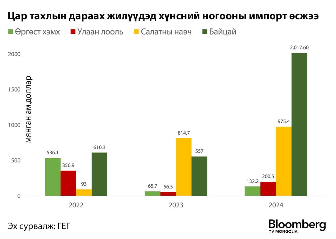 Монгол Улсын хүнсний ногооны импорт жил ирэх тусам нэмэгдсээр энэ он гарсаар 25.3 мянган тонн хүнсний ногоо импортлоод байна. Энэ нь өмнөх оны мөн үеэс 40.9 хувиар, 2022 оны мөн үеэс 2.5 дахин өссөн үзүүлэлт болохыг Гаалийн ерөнхий газрын мэдээллээс харж болохоор байгаа юм.