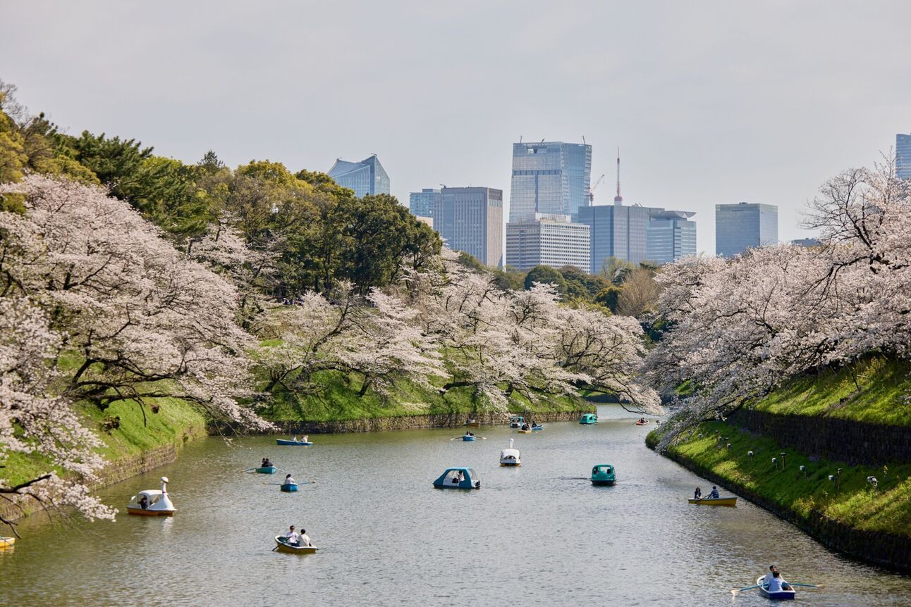 Цэцэглэсэн сакура моддыг үзэхээр Токиогийн Чидоригафүчи сувгаар завьтай явж буй хүмүүс