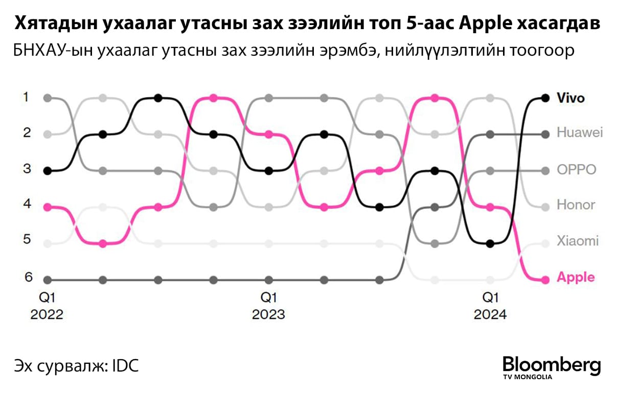 Дэлхийн ухаалаг утасны хамгийн том зах зээл БНХАУ-д Apple-ийн сүүлийн үеийн борлуулалт тун базаахгүй түвшинд байна. VI сараар эцэслэгдсэн улиралд iPhone-ийн БНХАУ дахь нийлүүлэлт 3.1 хувиар буурсан бол Android системтэй өрсөлдөгчид нь жилийн дүнгээр борлуулалтаа 11 хувиар өсгөжээ. Ингэснээр Хятадын зах зээлд эзлэх хувь хэмжээгээр Apple компани сүүлийн дөрвөн жилд анх удаагаа эхний тавд багтаагүйг IDC-ийн статистик харуулж байна.