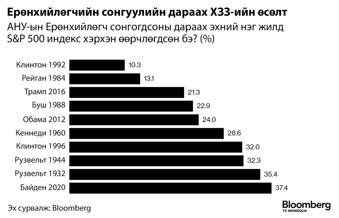 Хөрөнгийн зах сонгуулийн жилд: Ерөнхийлөгчийн сонгууль болох жил АНУ-ын хувьцааны зах зээлд ерөнхийдөө ээлтэй байсаар иржээ. S&P 500 индекс “dotcom”-ийн хөөсрөл, дэлхийн санхүүгийн хямрал болсон 2000, 2008 онуудыг эс тооцвол 1960 оноос хойших бүх сонгуулийн жилд өсөлттэй байсан байна. Ялангуяа сүүлийн гурван сонгуулиар тус индекс багадаа 10 хувийн өсөлттэйгөөр тухайн жилийг үдэж байжээ.