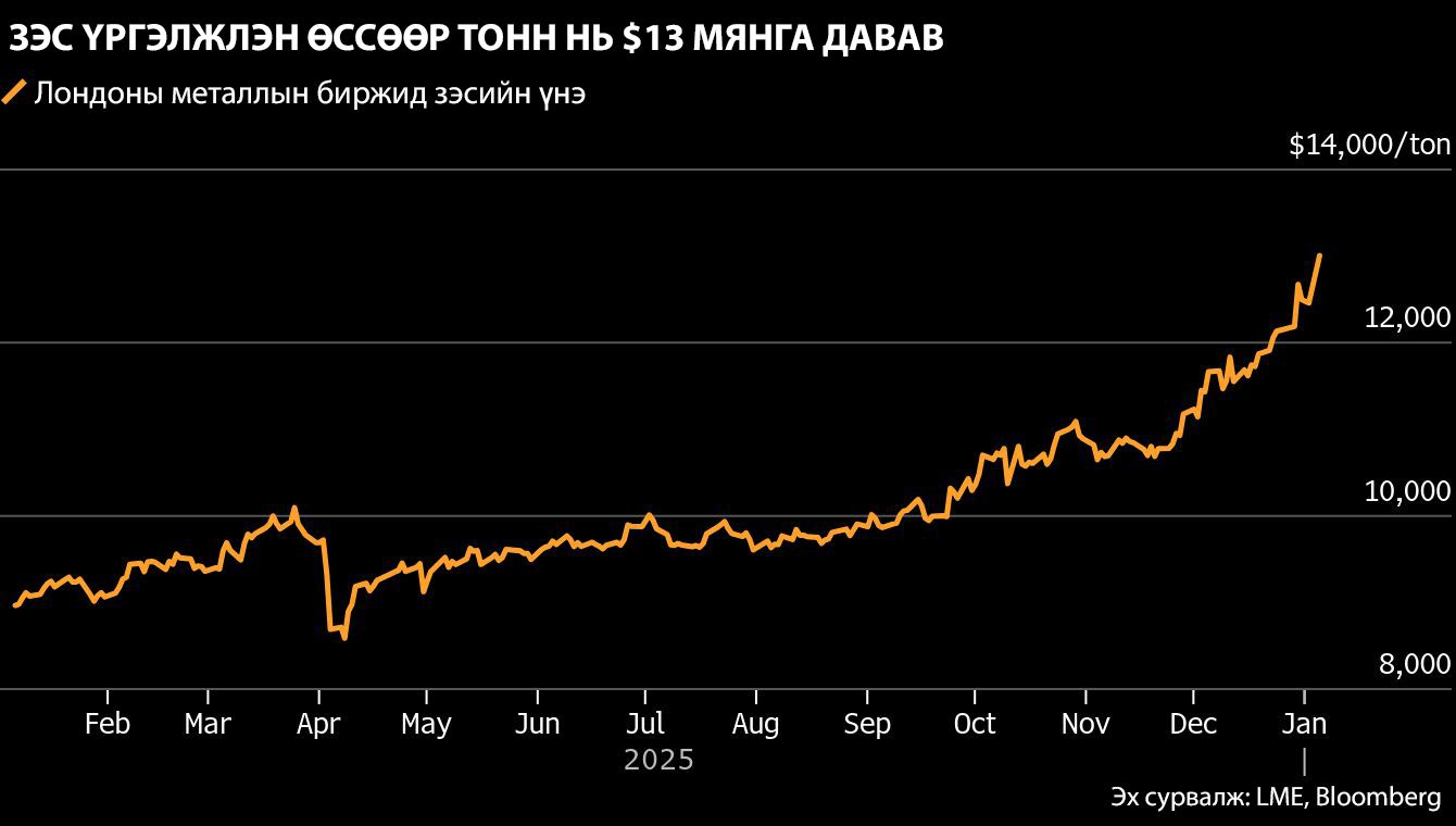 Хэдхэн хоногийн өмнө 12 мянган ам.доллар хүрч байсан зэсийн үнэ үргэлжлэн өссөөр мягмар гарагт Лондоны металлын биржид тонн нь түүхэнд анх удаагаа 13 мянган ам.долларын босго давлаа.