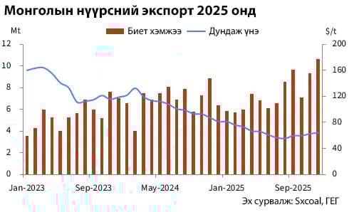 Оны хоёрдугаар хагаст арилжаа эрс сэргэснээр Монгол Улсын нүүрсний экспорт 2025 онд бүх цаг үеийн дээд хэмжээгээ шинэчилсэн байна.
