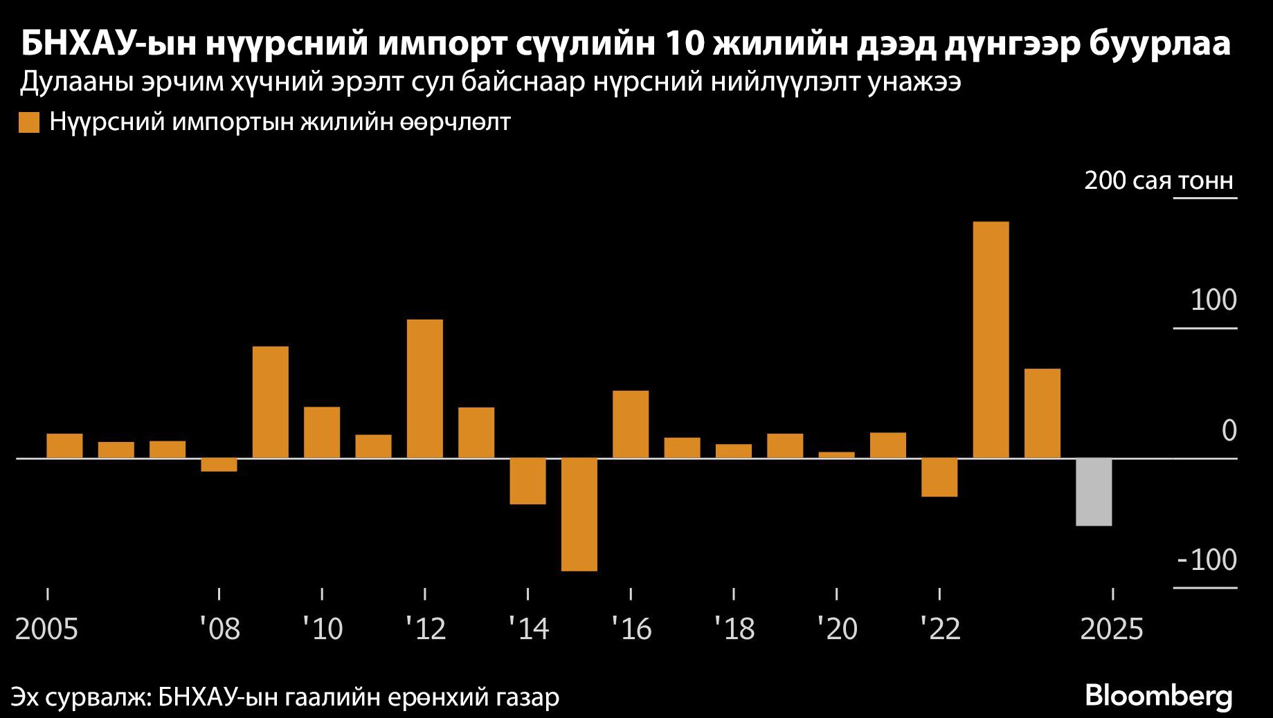 БНХАУ-ын нүүрсний импорт 2025 онд 490 сая тонноор хэмжигдэж, өмнөх оноос 9.6 хувиар буурсныг тус улсын Гаалийн ерөнхий газар мэдээллээ. Сүүлийн жилүүд дараалан дээд түвшнээ шинэчилж байсан тус улсын нүүрсний импорт 2022 оноос хойш анх удаа буурсан тохиолдол нь энэ болж байна.
