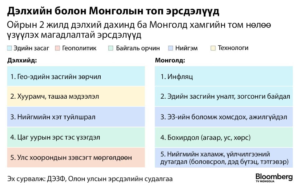 Улс тус бүрд тулгарах богино хугацааны эрсдэлүүдийг эрэмбэлсэн ДЭЗФ-ын судалгаанд Монголоос оролцогчид ирэх хоёр жилийн хугацаанд Монгол Улсад хамгийн том нөлөө үзүүлэх магадлалтай эрсдэлээр инфляцыг нэрлэжээ. Харин өнгөрсөн онд тэргүүлэх эрсдэлүүдээр нэрлэгдэж байсан ажиллах хүч, ур чадварын хомсдол ба эрчим хүчний нийлүүлэлтийн хомсдол энэ онд топ 5-д багтаагүй байна.
