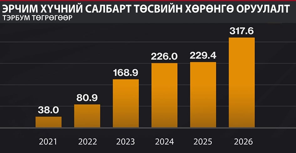 Сүүлийн таван жилийн хугацаанд улсын төсвөөс эрчим хүчний салбарт 743.4 тэрбум төгрөгийн хөрөнгө оруулалт хийсэн бол нийт зарцуулсан төсөв нь 1.3 их наяд гаруй төгрөг байна. 2026 онд тус салбарт 317.6 тэрбум төгрөгийн хөрөнгө оруулалт хийхээр баталсан нь 2021 оныхоос найм дахин өндөр дүн юм.