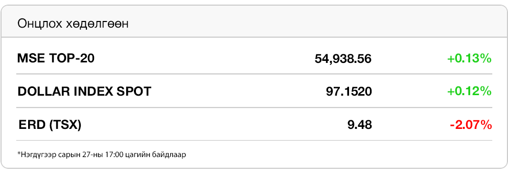 Өглөөний мэнд. Erdene Resource Development зэс, молибденийн "Зуун мод" төслөө санхүүжүүлэхээр $25 саяыг босголоо. ТӨК-иудын ашигт ажиллагааг доош татдаг гол хүчин зүйл нь Төр өөрөө. TMK Energy-ийн “Гурвантэс XXXV” төслийн хийн гарц 5 сар дараалан өссөн байна.