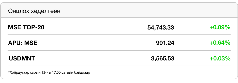 Өглөөний мэнд. АПУ ХК-ийн 2025 оны цэвэр ашгаасаа хуваарилах ногдол ашиг тус компанийн түүхэн дэх хамгийн өндөр дүнтэй нь болно. Төгрөгийн хадгаламж оны эхний сард 4.3 их наяд төгрөг хүрч өмнөх оны мөн үеэс 20 хувиар өссөн байна. Эрчим хүчний нүүрс олборлогчдоос Шивээ-Овоо ХК 2025 онд 1.7 тэрбум төгрөгийн цэвэр ашигтай ажиллав.