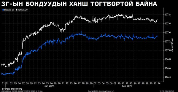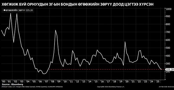 “JPMorgan Chase”-ийн хөгжиж буй орнуудын бондын өгөөжийн зөрүүг хэмждэг индекс 2007 оноос хойших доод түвшинд хүрсэн. Өнгөрсөн оны дөрөвдүгээр сараас хойш хөрөнгө оруулагчид эдгээр бондын худалдан авалтаа тогтмол нэмэгдүүлсэн хандлага 2026 онд ч үргэлжлэхээр байна.