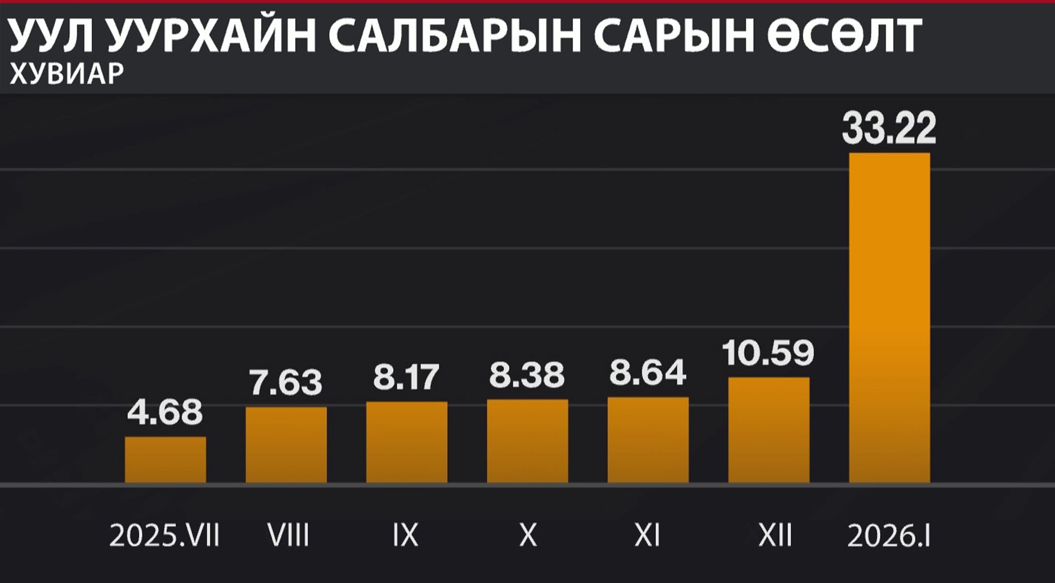 Оны эхний сард нүүрсний олборлолт 55.7 хувиар, зэсийн баяжмалын олборлолт 32.6 хувиар өссөн нь салбарын өсөлтийн гол хөдөлгүүр болж байна. Ингэснээр уул уурхайн салбар нийт өсөлтийн 5.5 нэгж хувийг дангаараа бүрдүүлж буй.