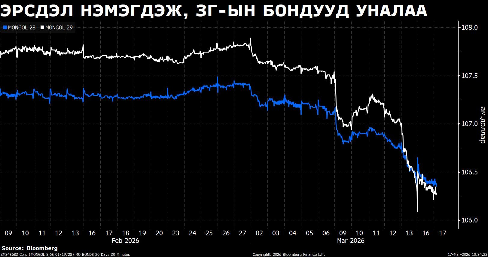 Ираны дайн үргэлжилж буй энэ үед өндөр өгөөжтэй, хөгжиж буй орнуудын бондуудын ханш уналтаа үргэлжлүүлсээр байна. Тухайлбал 2028 болон 2029 онд хугацаа нь дуусах бондуудын ханш гуравдугаар сар гарсаар 1 орчим хувиар буураад байгаа юм.