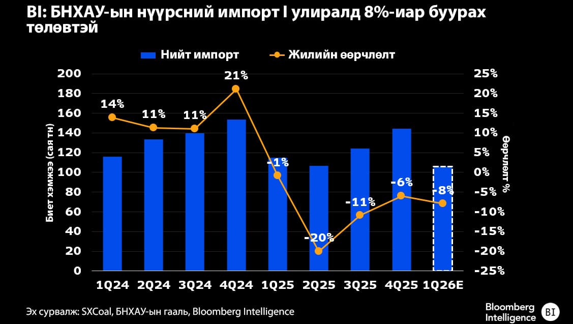 Иймд геополитикийн зөрчил, гол нийлүүлэгч Индонезийн тээвэрлэлтийн өртөг нэмэгдсэнээс шалтгаалж тус улсын нүүрсний импорт 2026 оны эхний улиралд биет хэмжээ нь өмнөх оноос 8 хувиар буурч 106 сая тонн болох төсөөллийг BI танилцууллаа.