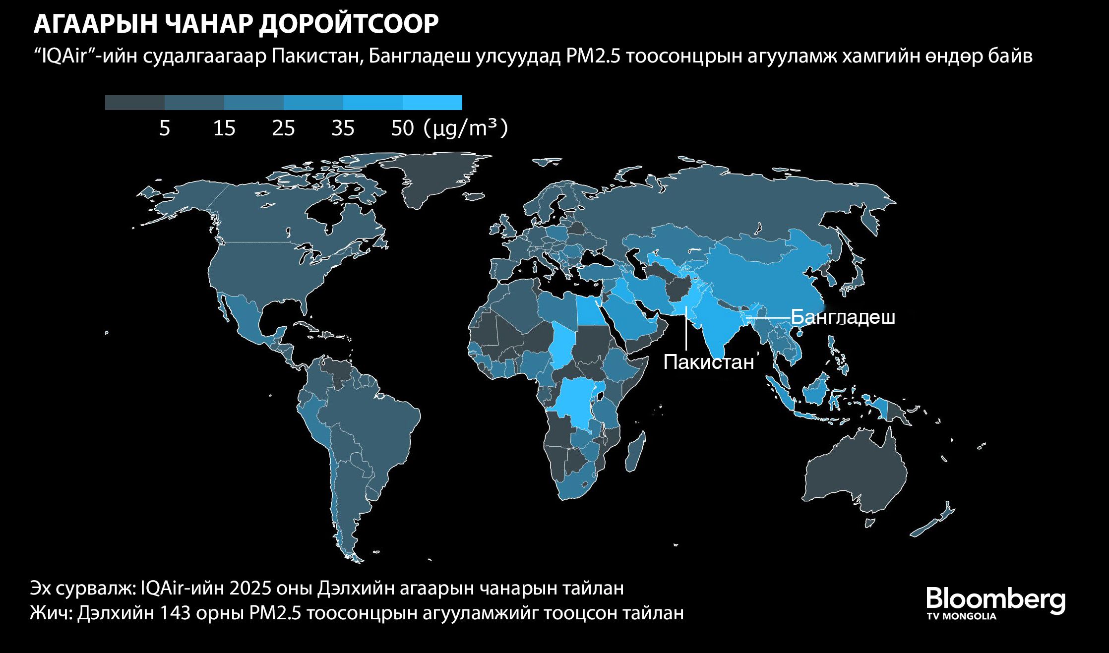 Тайланд дурдсанаар хамгийн бохирдолтой хотуудын дийлэнх нь Энэтхэг, Пакистан, БНХАУ-ын хотууд байгаа бол жилийн дундаж PM2.5 үзүүлэлтээр Пакистан, Бангладеш улс тэргүүлжээ. Харин Монгол Улсын нийслэл Улаанбаатар хотын хувьд 9400 гаруй хотоос бохирдлоороо 1211 дүгээрт эрэмбэлэгджээ. 2025 онд Улаанбаатарын агаар дахь PM2.5 тоосонцрын агууламж дунджаар 17.9 байсныг тогтоосон нь өмнөх онд 25.7 байсантай харьцуулбал 30 хувиар буурсан үзүүлэлт болсон байна.