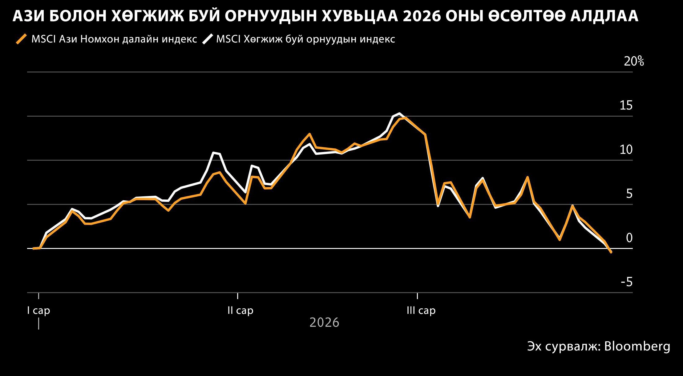 Хөрөнгө оруулагчид хиймэл оюуны дэд бүтцийн хувьцаануудыг ихээр худалдан авснаар хөгжиж буй зах зээлүүд 2026 оныг эрчтэй эхлүүлж байсан юм. Сүүлийн зарах урсгал анх эрчим хүч импортлогч улс орнуудад төвлөрч байсан бол одоо Ойрх Дорнодын дайн дэлхийн эдийн засагт сөргөөр нөлөөлөх эрсдэлийн улмаас зарах хандлага бүс нутаг даяар тархаад байна.