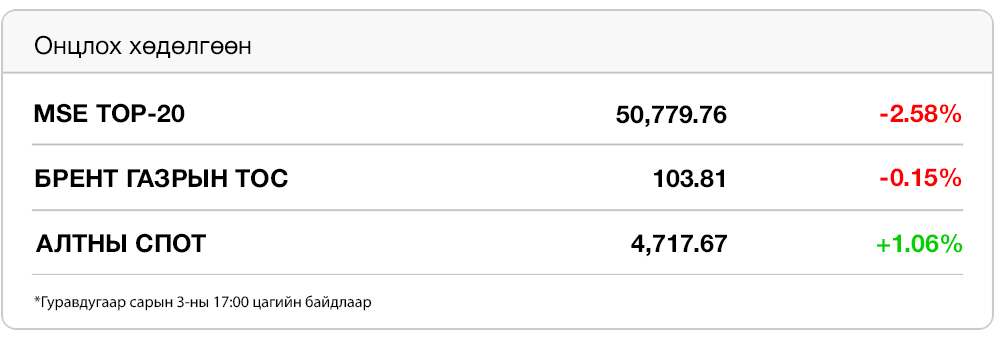 Өглөөний мэнд. Тавантолгой ХК сүүлийн дөрвөн жилийн хамгийн тааруу үзүүлэлттэй тайлангаа танилцууллаа. Дональд Трамп Ираны дайныг 2-3 долоо хоногт дуусгахаа мэдэгдэж, зах зээл эрчтэй сэргэлээ. Шинэ ЗГ-т зарим салбарын Сайд нарыг улираан ажиллуулахаар байгааг Ерөнхий сайд Н.Учрал мэдэгдэв.