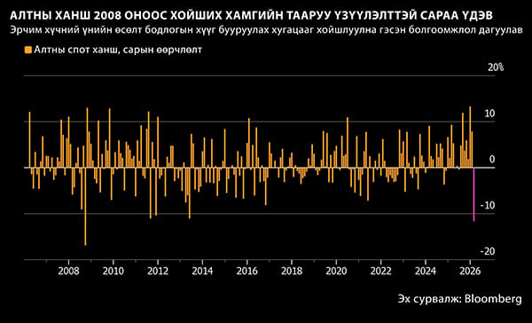Гуравдугаар сард алтны үнэ 12 хувиар суларсан нь сарын дүнгээр дэлхийн санхүүгийн хямралаас хойш байгаагүй уналт аж.