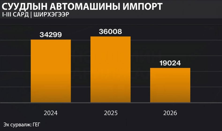 Нефтийн бүтээгдэхүүний импорт нэмэгдэж буй ч автомашины импорт сүүлийн гурван жилийн доод түвшинд хүрч буурсан байна. I-III сард улсын хэмжээнд нийт 19 мянга гаруй суудлын автомашин импортолсон нь өмнөх оны мөн үеэс 47 хувиар доогуур үзүүлэлт болжээ.