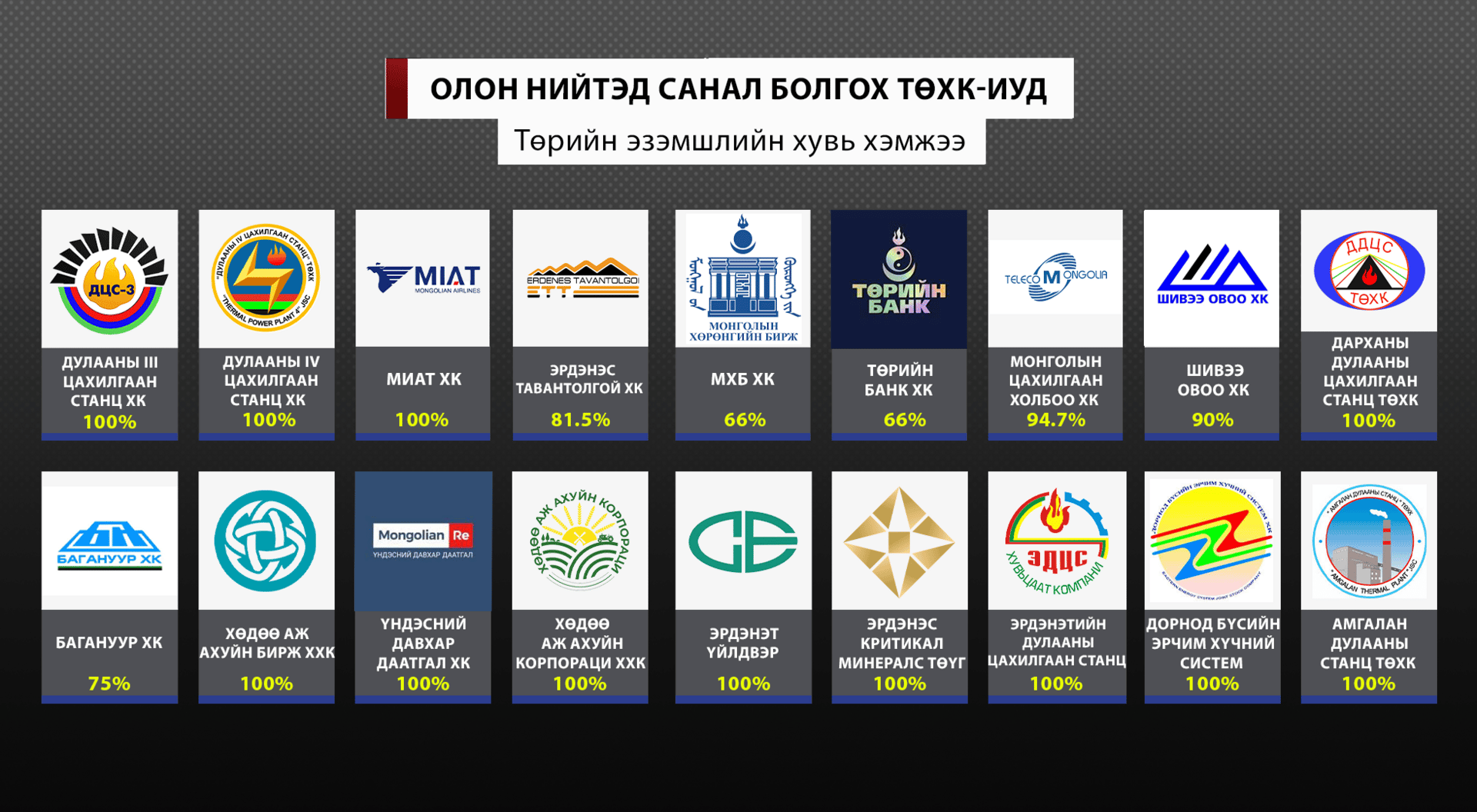 Нээлттэй болох МИАТ. Төрийн өмчит хуулийн этгээдийн хувьцааг 2026-2028 онд биржээр олон нийтэд нээлттэй худалдах, төрийн өмчийг хувьчлах, өөрчлөн байгуулах үндсэн чиглэл батлах тухай Улсын Их Хурлын тогтоолын төслийг өргөн мэдүүллээ. Ингэснээр 18 төрийн өмчит компани, үйлдвэрийн газруудын 10-66 хүртэлх хувийн хувьцааг нээлттэй санал болгох юм.