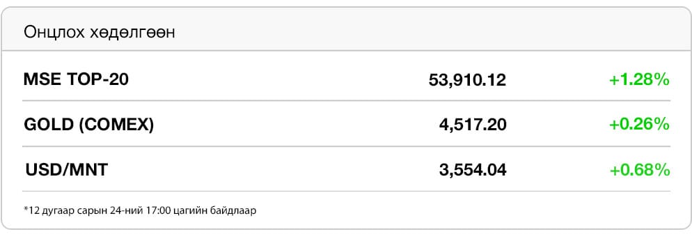 Алтны халуурал. Геополитикийн хурцадмал байдал, бодлогын хүү буурах хүлээлтийг илтгэж буй үнэт металлуудын үнийн өсөлт үргэлжилж, алт, мөнгөний үнэ бүх цаг үеийн дээд цэгээ шинэчлэн тогтоолоо. Гурван өдөр дараалан “ногоон бүс”-д байсан алтны спот ханш лхагва гарагт 1 хүртэл хувиар өсөж, унц нь түүхэнд анх удаа 4,500 ам.доллар давав. Харин мөнгөний ханш 3.7 хувиар өсөж, унц нь 70 ам.доллар давсан бол цагаан алтны ханш 10 арилжаа дараалан цойлж, унц нь мөн анх удаагаа 2,300 ам.доллар давжээ.