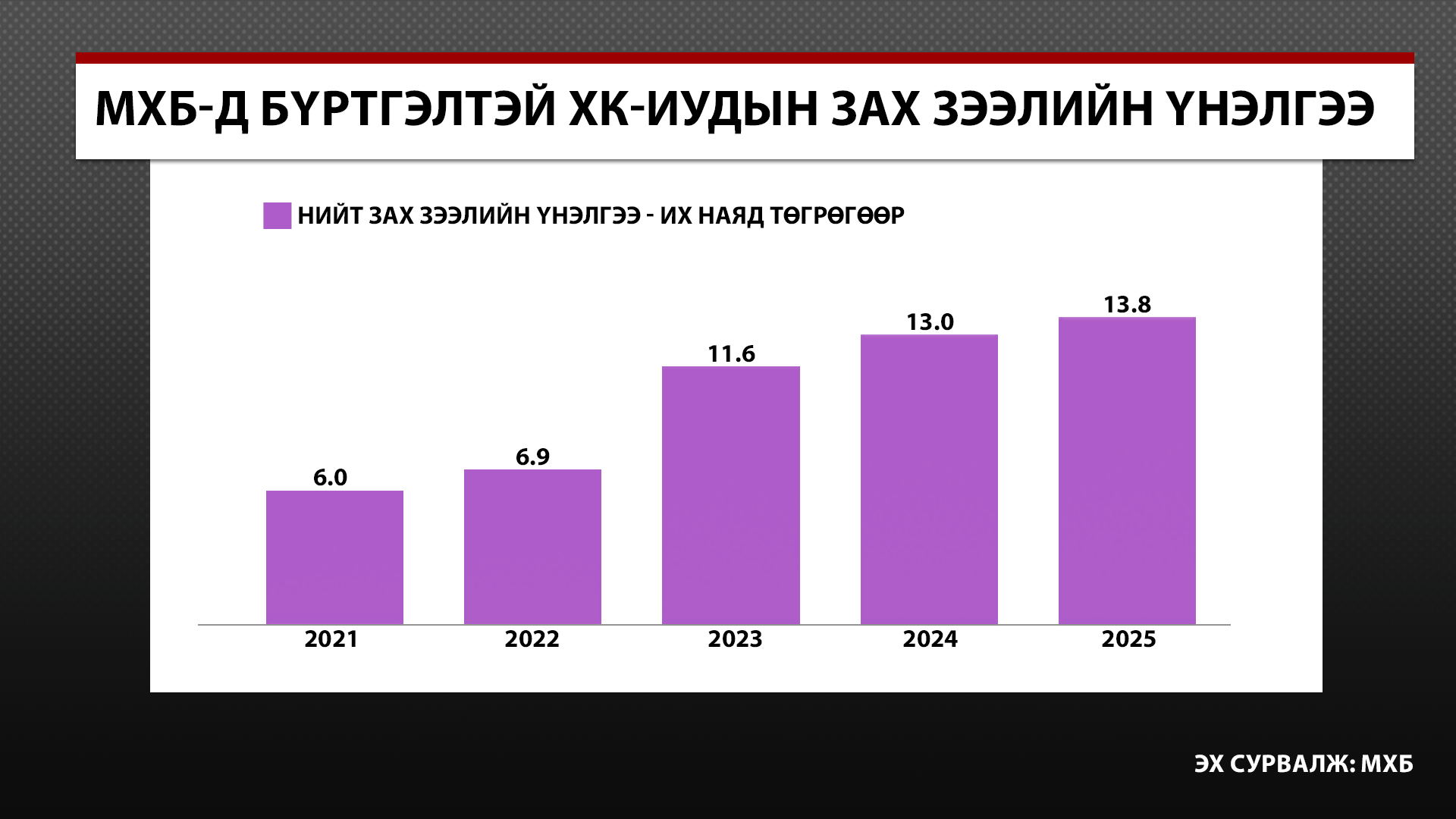 Монголын Хөрөнгийн Биржийн арилжаа уламжлал ёсоор оны сүүлд идэвхжиж, ТОП-20 индекс болон бүртгэлтэй компаниудын зах зээлийн үнэлгээ түүхэн дээд түвшнээ шинэчиллээ. Зах зээлийн үнэлгээ 13.8 их наяд хүрч, өнгөрсөн оны эцсээс 7 орчим хувиар өссөн боловч ДНБ-д эзлэх харьцаа бараг хэвээр буюу 16 хувь орчимд үлдэж байна. Мөн их наяд төгрөгөөс дээш үнэлгээтэй компаниудын клубт Эрдэнэс Ресурс Девелопмент болон ХасБанк нэгдэж, зургуулаа боллоо. Эдгээр аваргууд нийлээд нийт зах зээлийн 70 гаруй хувийг бүрдүүлж байна.