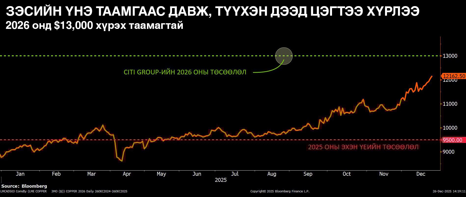 Эрчим хүчний шилжилтийн амин чухал түүхий эдэд тооцогдох зэс энэ оны хүсэмжит металлуудын нэг байж, үнэ нь түүхэнд анх удаагаа 12 мянган ам.долларын босгыг давсан. Томоохон уурхайнуудын ажиллагаа саатсанаас үүдэлтэй нийлүүлэлтийн бууралт, АНУ-ын Ерөнхийлөгч Дональд Трампын худалдааны бодлогын тодорхойгүй байдал зэргээс шалтгаалж зэсийн үнэ 2025 онд 35 орчим хувиар өсөж, 2009 оноос хойших хамгийн өндөр өсөлттэй жилээ үдэж байна.