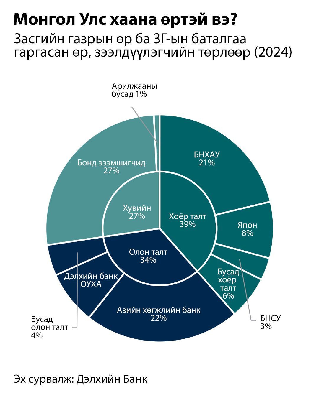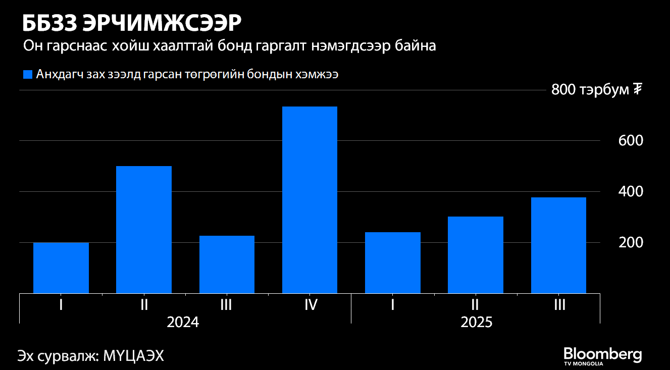 2025 онд ББЗЗ-д төгрөгийн бондоор 1.6 их наяд төгрөг, ам.долларын бондоор 63.9 сая ам.долларын хөрөнгө татан төвлөрүүлсэн байна. Харин 2021 онд ББЗЗ-ийн үйл ажиллагаа анх эхэлснээс хойш компаниудын нийт татан төвлөрүүлсэн хөрөнгийн хэмжээ 5 их наяд төгрөгт хүрчээ. Өнгөрсөн оны эцэст нийт гаргасан бондуудын 47 хувийг бүрдүүлж байсан санхүүгийн салбарын компаниудын эзлэх хувь 2025 онд буурч, бодит эдийн засгийн салбарын компаниуд өрийн хэрэгслийн зах зээлд илүү идэвхтэй оролцож эхэлсэн юм.