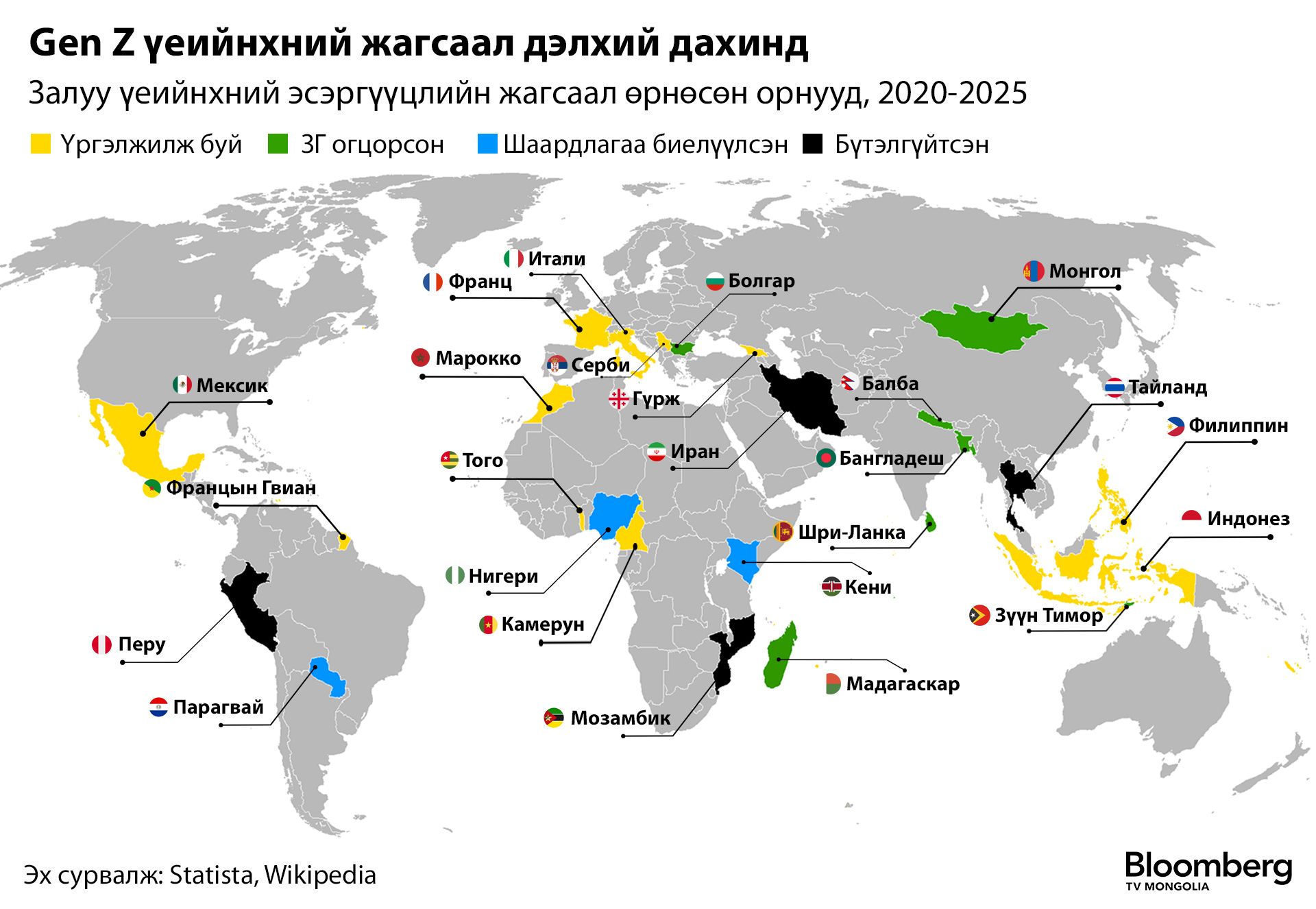 Монгол, Балба, Мадагаскар, Болгар улсуудад Засгийн газар нь унасан бол Индонез, Перу, Серби зэрэг улсуудад залуусын удирдсан жагсаал цуглаан мохолгүй үргэлжилж байна. Carnegie Protest Tracker-ийн мэдээлснээр 2025 онд 10 мянга болон түүнээс дээш хүн оролцсон 53 удаагийн жагсаал болсон нь 2017 онд анх бүртгэж эхэлснээс хойших дээд үзүүлэлт аж.