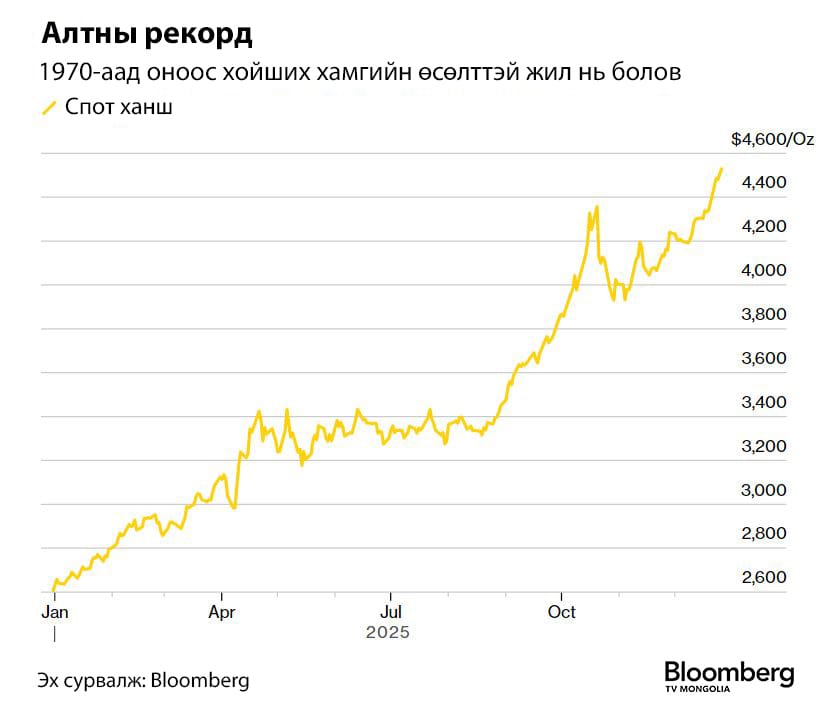 Ороо бусгаа, тодорхойгүй цаг үед хөрөнгө оруулагчдын хоргодох байр болдог алтны үнэ энэ онд унц нь анх удаагаа 4,500 ам.долларт хүрлээ. Нэг жилд 70 гаруй хувиар ингэж эрчтэй өсөж, дээд түвшнээ удаа дараалан шинэчилсэн тохиолдол сүүлийн 40 гаруй жилийн түүхэнд гарч байсангүй. Төв банкнууд эрчтэйгээр худалдан авч, алт дагадаг ETF-үүдэд орох урсгал үерлэсэн нь алтны өсөлтөд гол дэмжлэг болов. Өргөн дүр зургаараа алт ам.долларыг орлож, эрсдэлээс хамгаалах гол хөрөнгө оруулалтын хэрэгсэл болж буйг Кен Гриффин, Рэй Далио зэрэг алдарт хөрөнгө оруулагчид хэлж байсан юм.