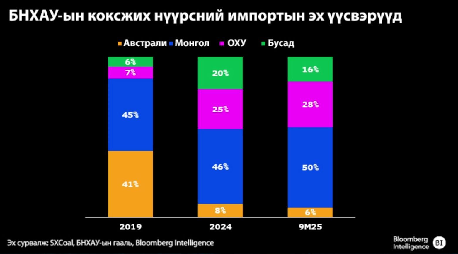 Одоохондоо Монгол Улс БНХАУ-ын кокжсих нүүрсний гол импортын түнш нь хэвээр байна. 2025 оны эхний есөн сарын байдлаар Монгол болон ОХУ нь БНХАУ-ын коксжих нүүрсний нийт импортын 80 шахам хувийг бүрдүүлжээ.