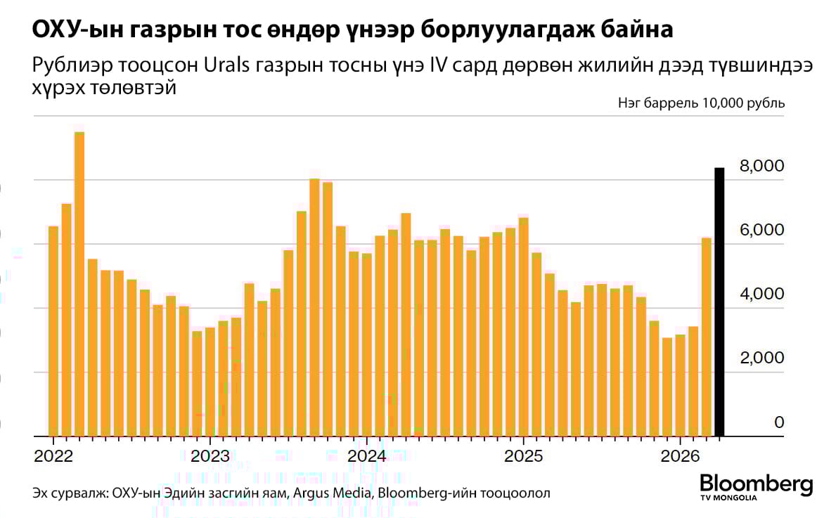 Ормузын хоолой хаагдсан нь Ойрх Дорнодын эрчим хүчний нийлүүлэлтийг саатуулж, дэлхийн зах зээлийг доргиосон энэ үед дайны “чимээгүй” ялагчаар Москва ийнхүү тодорч байна. ОХУ-ын 2026 оны төсөвт баррель нь 59 ам.доллар байхаар тусгасан “Urals” газрын тосны үнэ ийнхүү тэнгэрт хадсан тул өнгөрсөн сард тус улсын Засгийн газар төсвийн зарцуулалтаа нэмэгдүүлэхээр шийдвэрлэжээ.